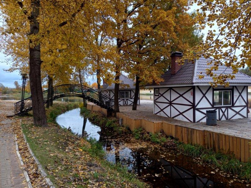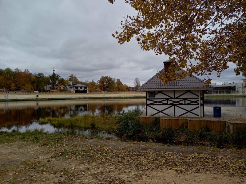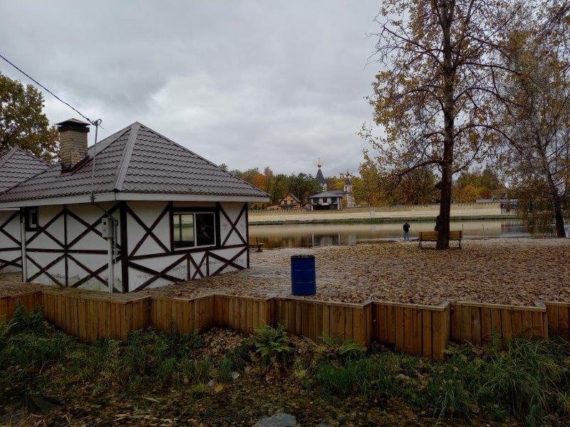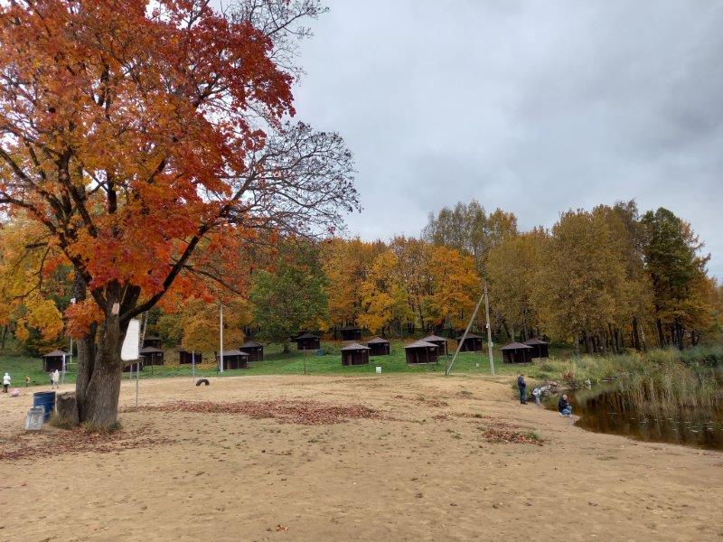 От парка есть спуск к Колтушскому озеру, с пляжем и беседками с мангалами, которые, как мы поняли, сдаются в аренду. В октябре месяце мы встретили "человека купающегося" (как это перевести на латынь?).